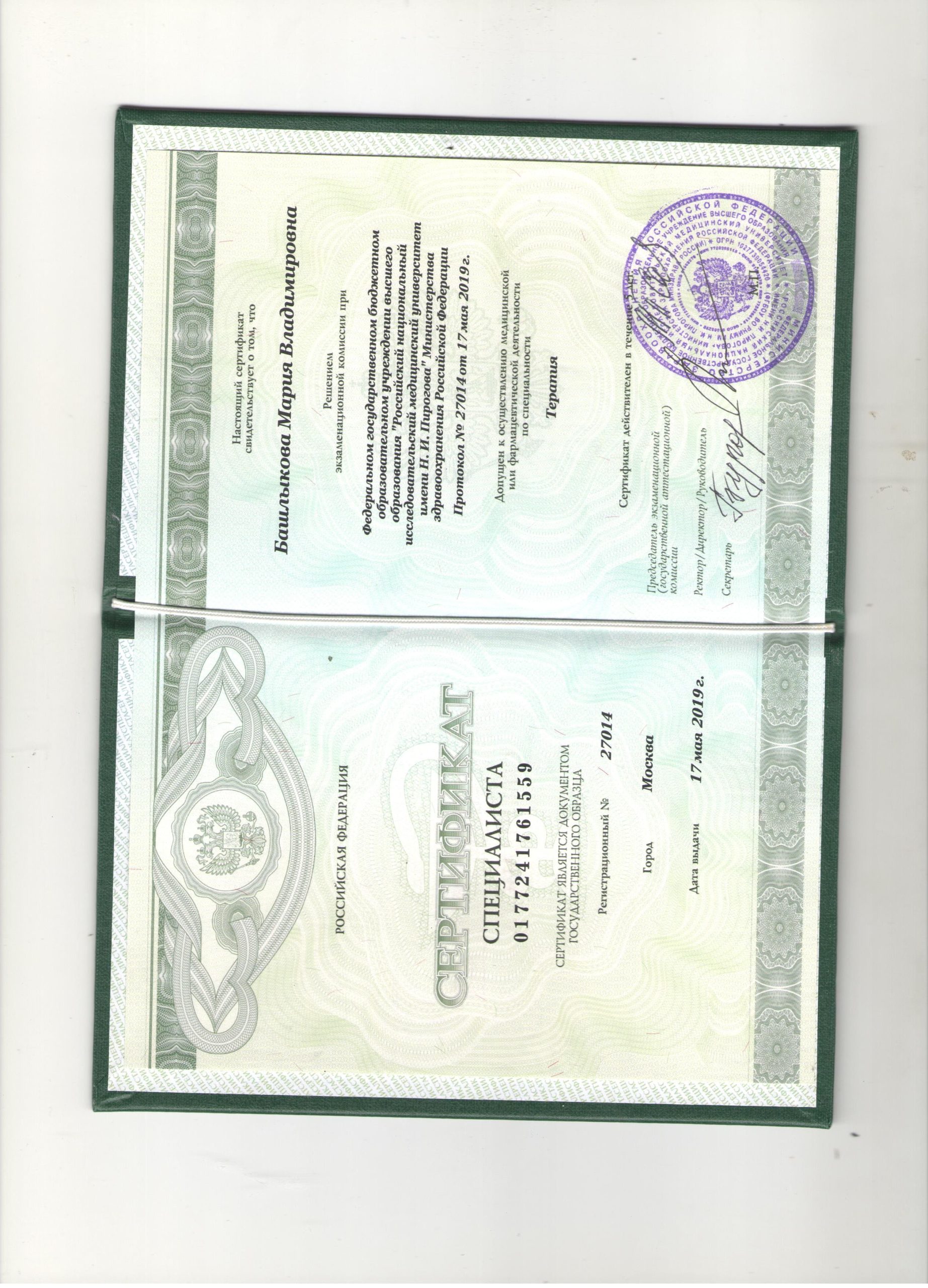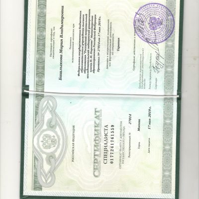 2019 г. — Сертификат специалиста « Терапия» Федеральное государственное бюджетное образовательное учреждения высшего образования «Российский национальный исследовательский медицинский университет имени Н.И.Пирогова» МЗ РФ