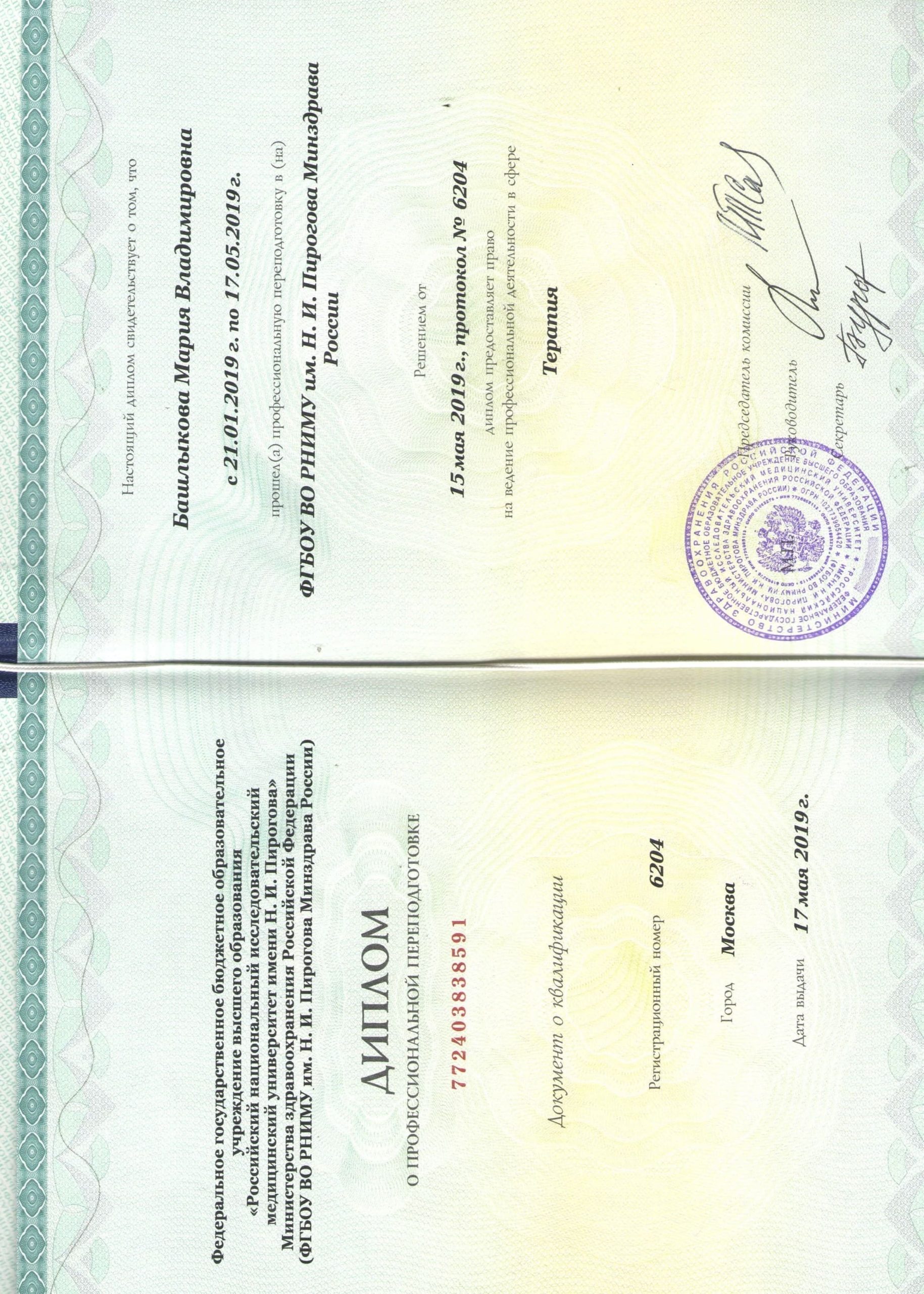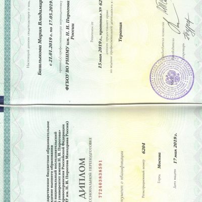 2019 г. — Диплом о профессиональной переподготовке « Терапия» ФГБОУ ВО РНИМУ им. Н.И. Пирогова Минздрава России